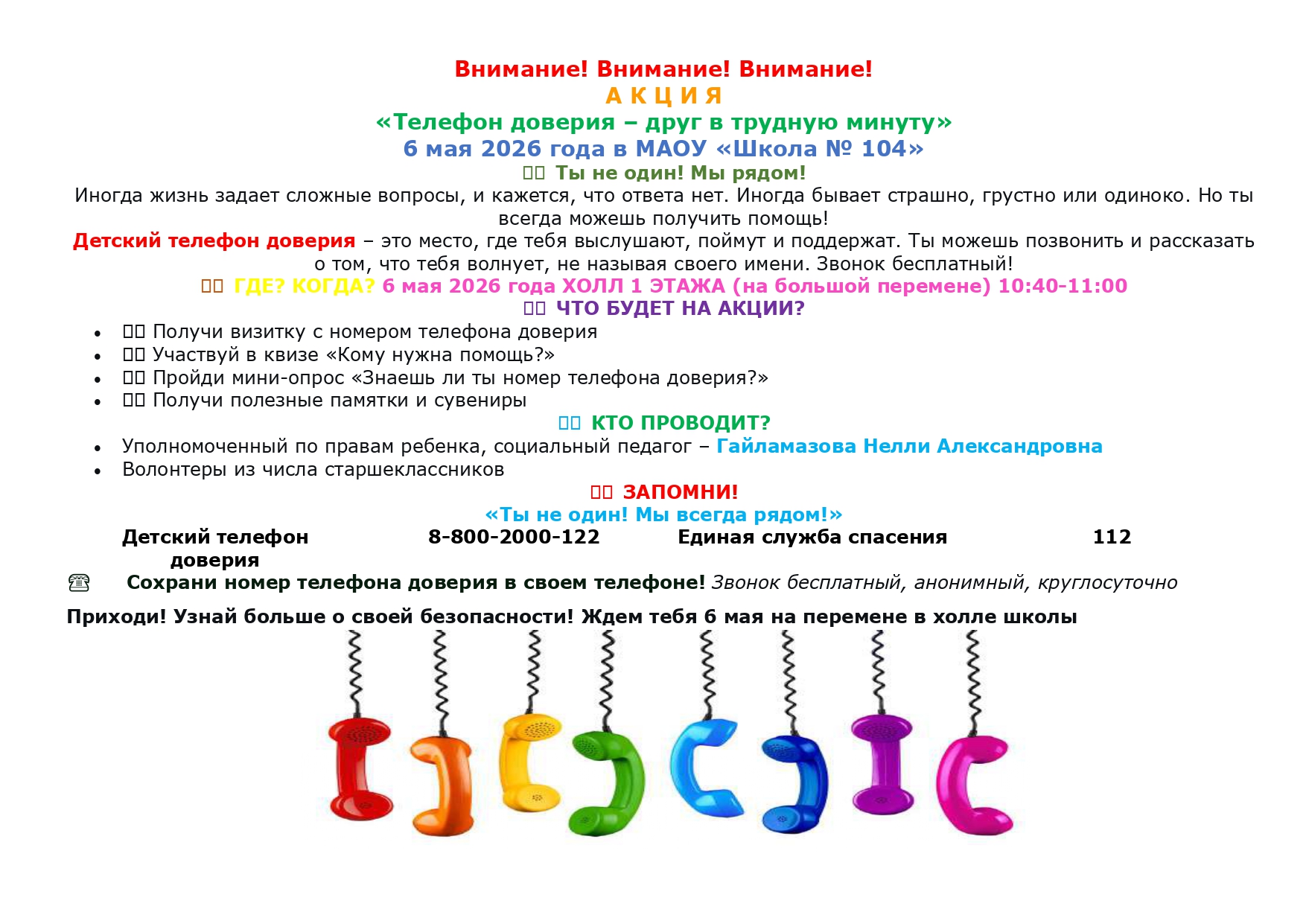 Внимание! 06 мая 2026г 10:40-11:40 в холле первого этажа пройдет АКЦИЯ "Телефон доверия-друг в трудную минуту"